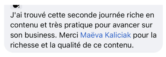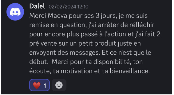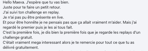 Un challenge complet, authentique. Maeva donne sans compter et vous permettra d'avoir la clarté nécessaire à la mise en action. Merci pour ces 4 jours de partage, de générosité et de parlé vrai. 🙌🔥❤️