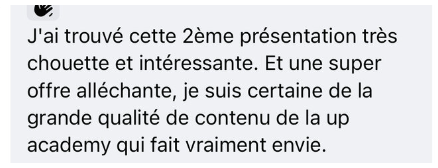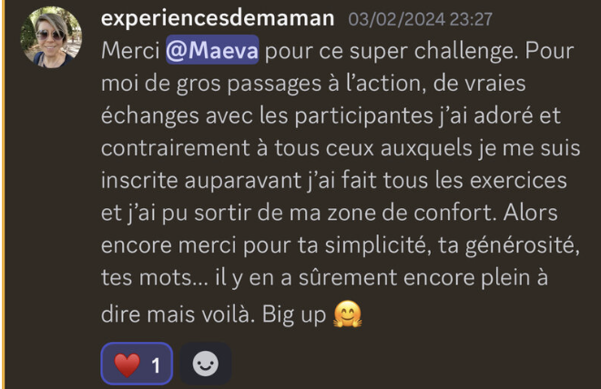Le challenge était clair et actionnable. C’est hyper généreux tout ce que tu as partagé, les exercices permettent de mettre directement en application, la communauté encourage et porte vers le haut. En 4 jours je me suis rendue compte de la valeur de ton accompagnement, ce n’est pas seulement le contenu hyper pertinent, c’est aussi tout le mindset qui pousse à faire et ne pas remettre à plus tard, et ça fait vraiment la différence.