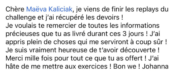 Ton challenge est le premier contenu gratuit auquel je participe qui m’a vraiment fait cogiter et m’a permis de prendre conscience de pas mal de choses. Il m’a vraiment aidée à avancer vers ce que je voulais, et ça fait beaucoup de bien ! Merci encore pour tout ce que tu partages